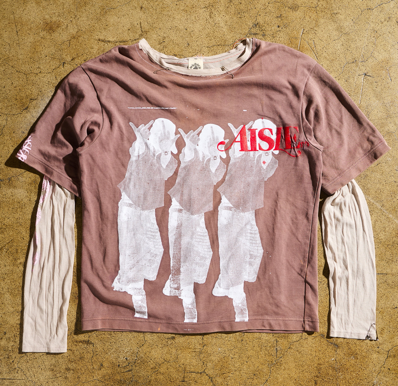 These are reworked by taking a vintage t shirt and vintage thermal and sewing them together. Accompanied by 3 images, 2 front hits and a right side sleeve hit. Safety pins attached to the collar and left sleeve wrists. EVERY PIECE ITERATES AND VARIATES IN SIZE AND COLOR.